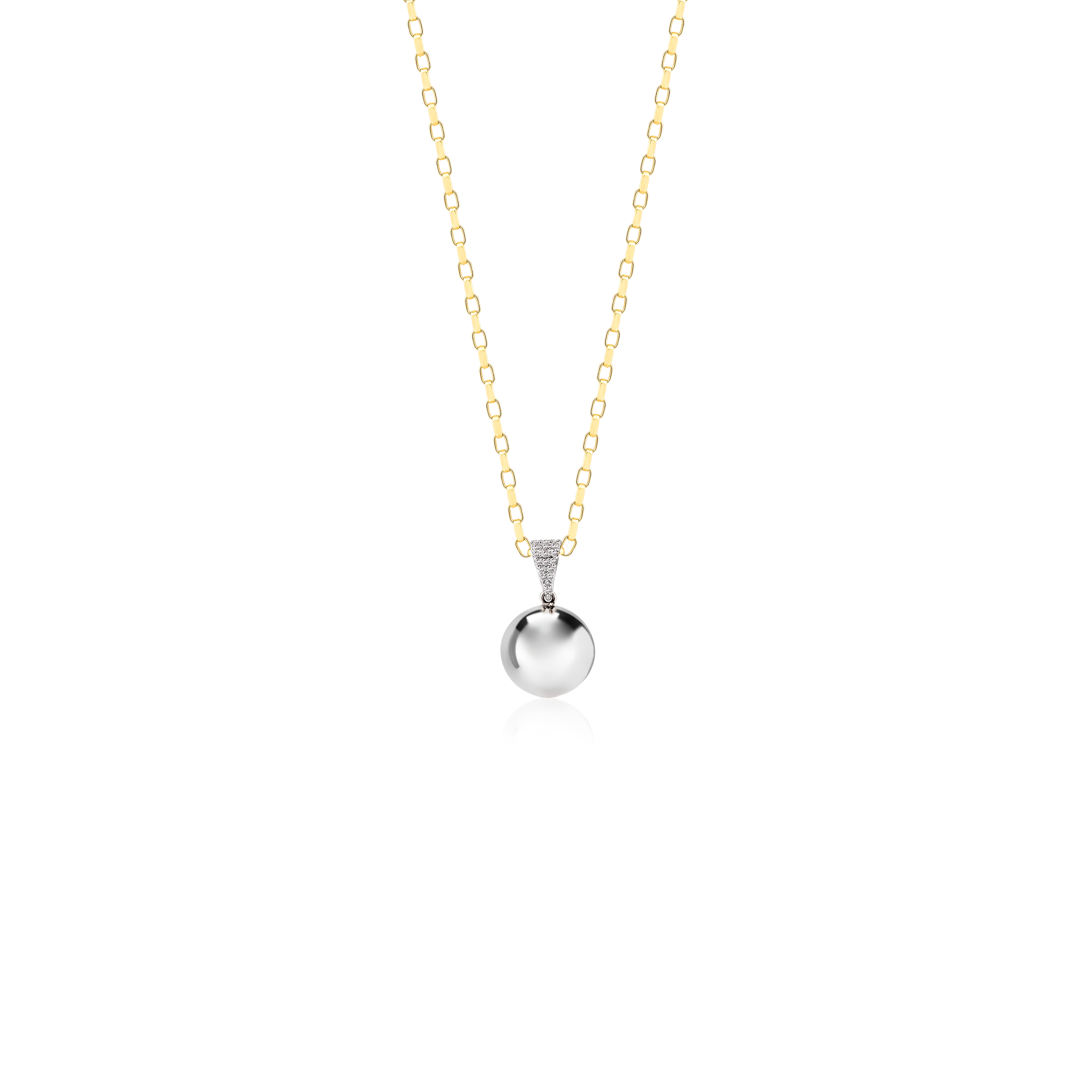 Reflecting a refined aesthetic, this design features a white gold sphere connected to its yellow gold chain by a bail elegantly pavé-set with diamonds.