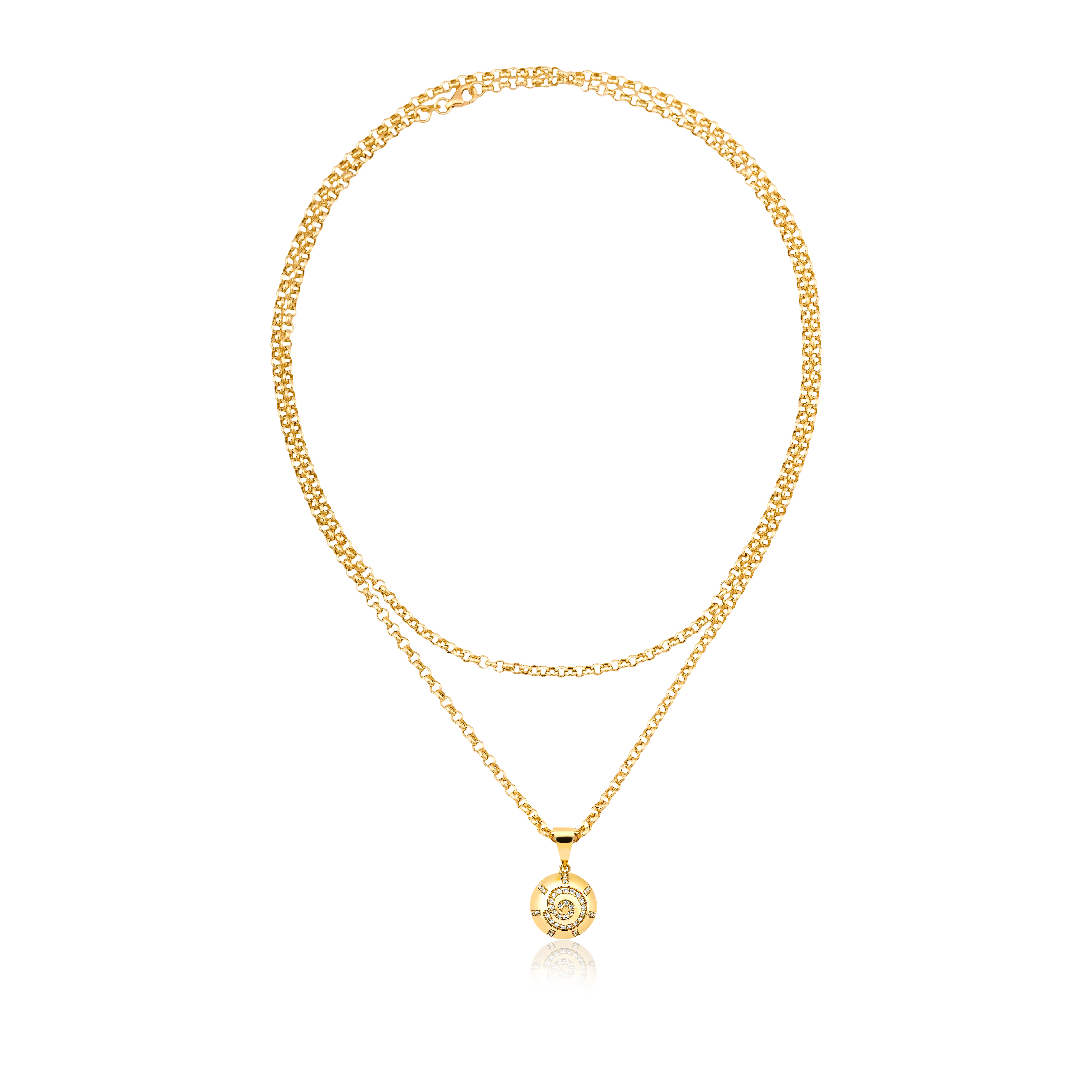 A radiant centerpiece crafted in solid 14K yellow gold. This striking piece highlights a sun motif, expertly engraved and accented with white diamonds.